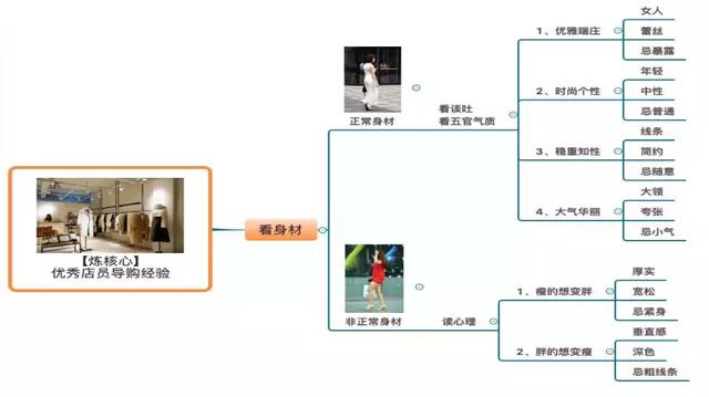 將進(jìn)入門店的客戶通過看身材分成結(jié)構(gòu)化兩大類,然后再通過和看五官、談吐、想瘦還是想胖再細(xì)分成六大類型,然后在推薦相應(yīng)的服裝,讓客戶試穿后,有眼前一亮的感覺,銷售自然大幅度提升了。