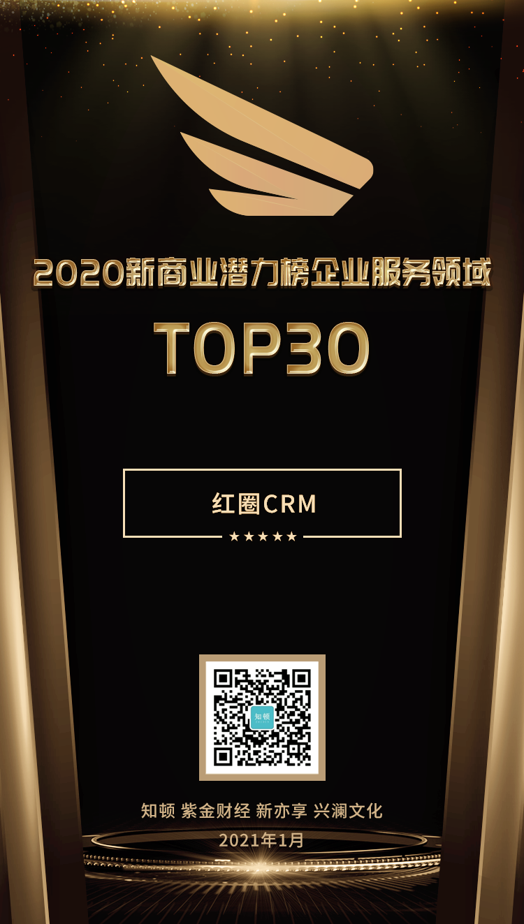 經過層層篩選,最終,紅圈CRM 創始人&CEO 劉學臣入選 “2020 新商業潛力榜人物TOP20”,紅圈 CRM 入選“ 2020 新商業潛力榜企業服務領域 TOP30”。