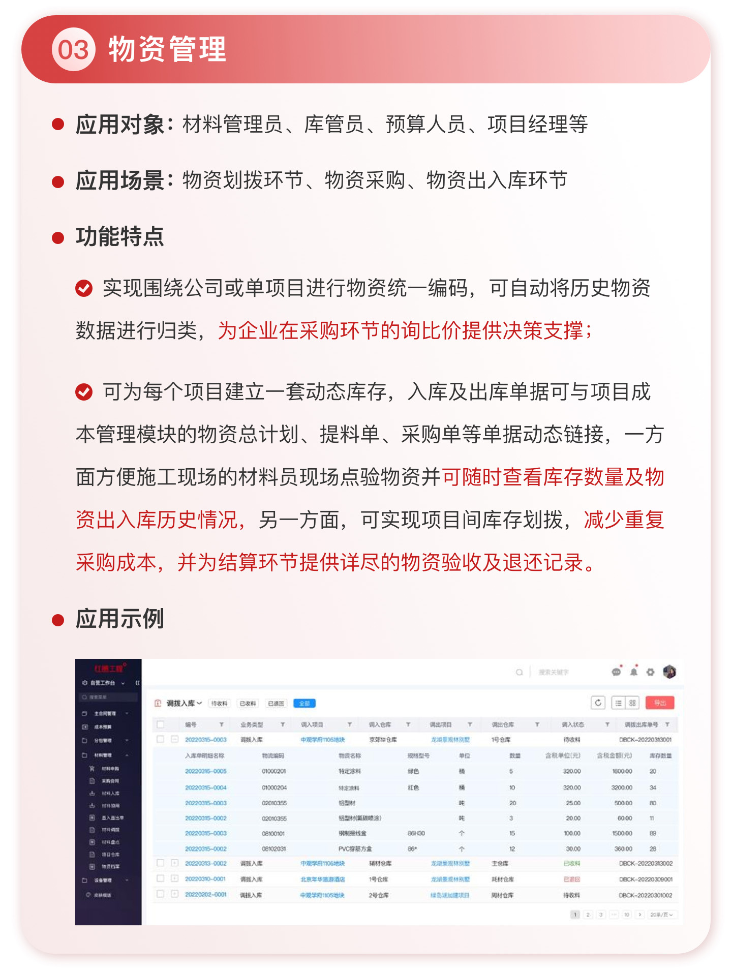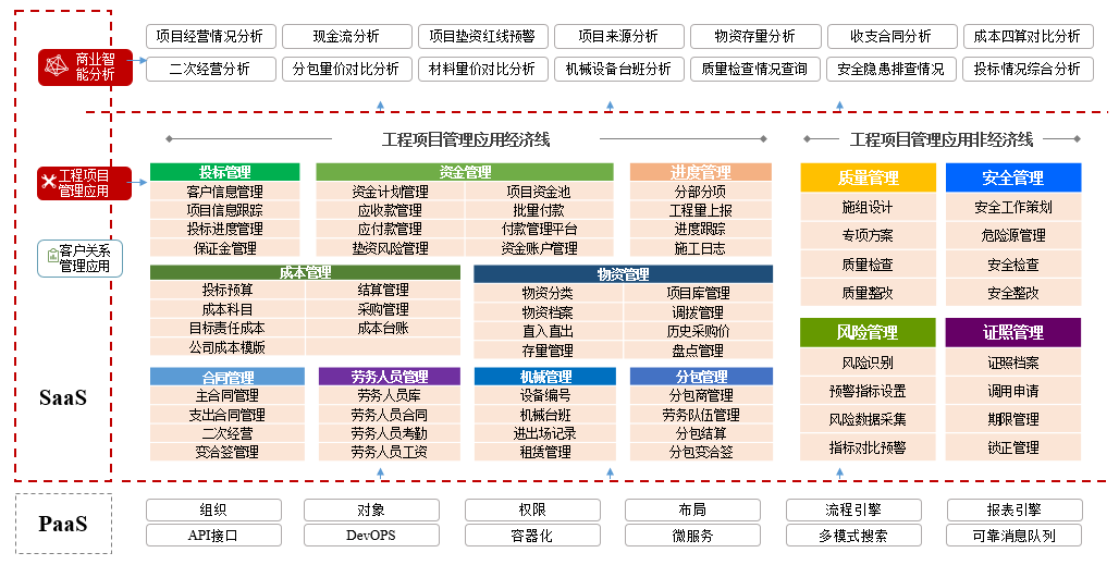 在工程項(xiàng)目管理領(lǐng)域,紅圈在 PaaS 平臺(tái)基礎(chǔ)上深入結(jié)合建筑工程企業(yè)的業(yè)務(wù)場(chǎng)景,針對(duì)其現(xiàn)金流管理薄弱、成本不可控、項(xiàng)目進(jìn)度滯后、質(zhì)量問題頻發(fā)和安全風(fēng)險(xiǎn)較多等痛點(diǎn),通過資金管理、成本管理、物資管理、安全質(zhì)量管理、投標(biāo)管理、勞務(wù)管理、證照管理等功能模塊,使執(zhí)行人員業(yè)務(wù)流程標(biāo)準(zhǔn)化、透明化。