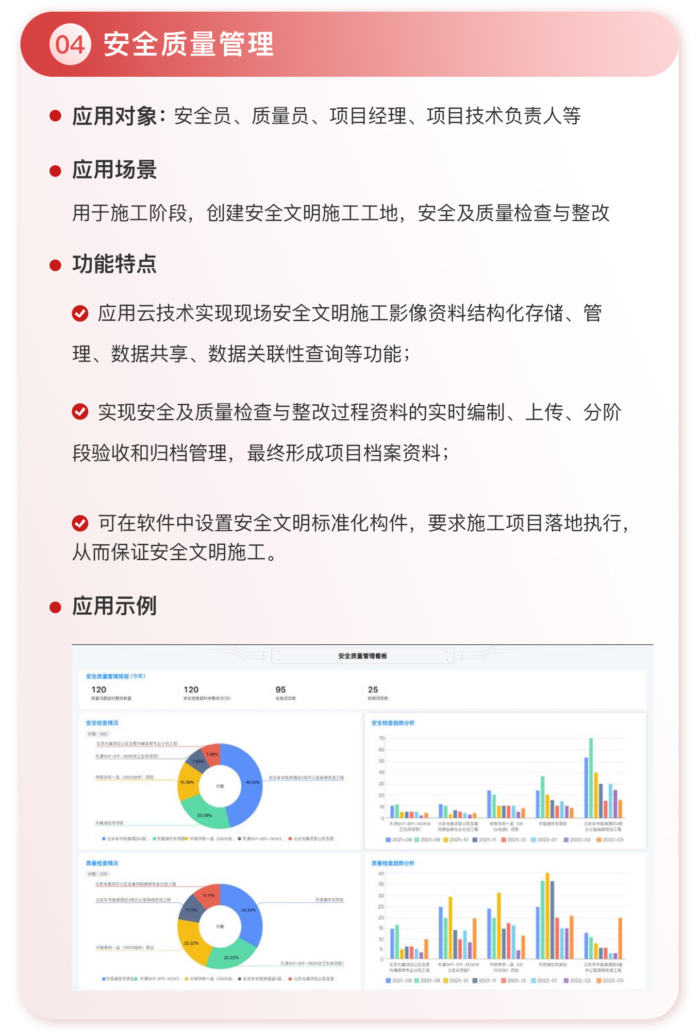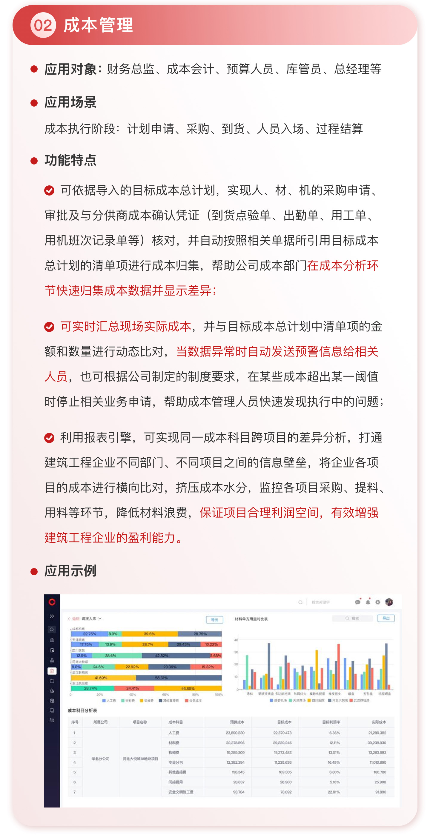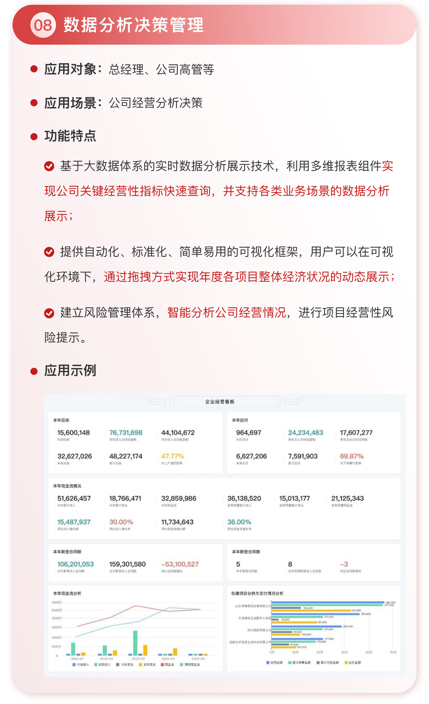 此外,紅圈系統(tǒng)能夠?yàn)榻ㄖこ唐髽I(yè)決策者實(shí)時(shí)呈現(xiàn)動(dòng)態(tài)數(shù)據(jù)、提供智能數(shù)據(jù)分析,讓管理者實(shí)時(shí)了解項(xiàng)目的整體運(yùn)營(yíng)效率及效益是否達(dá)標(biāo)、經(jīng)營(yíng)風(fēng)險(xiǎn)是否可控,滿足建筑工程企業(yè)數(shù)字化管理升級(jí)的需求,提升企業(yè)經(jīng)營(yíng)管理能力,實(shí)現(xiàn)工程項(xiàng)目施工全生命周期的降本增效。該產(chǎn)品主要應(yīng)用于產(chǎn)值為 5,000 萬-20 億的建筑工程行業(yè)企業(yè)。