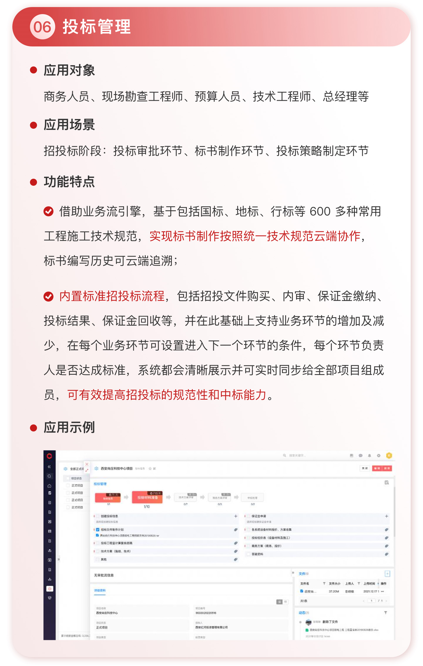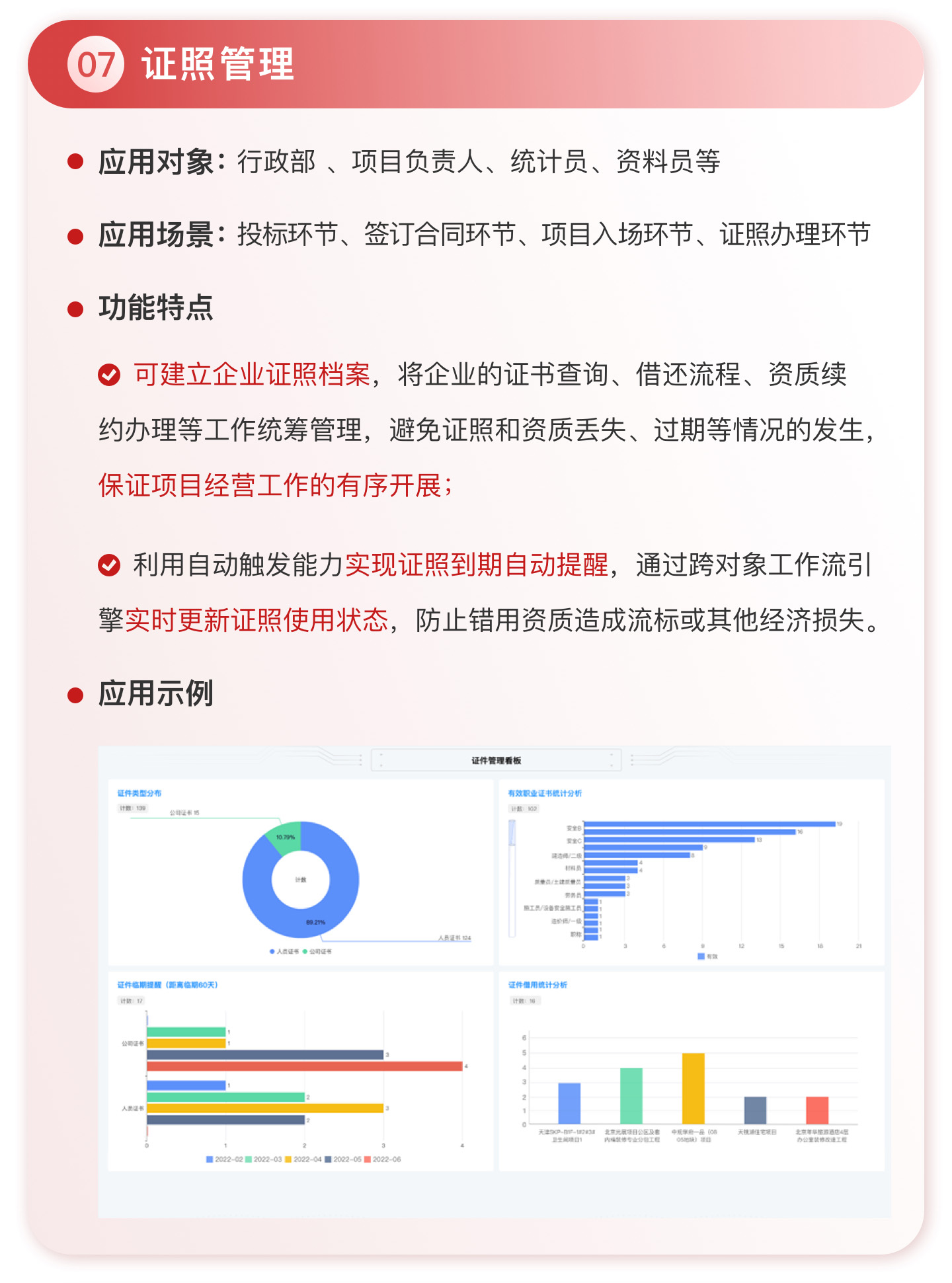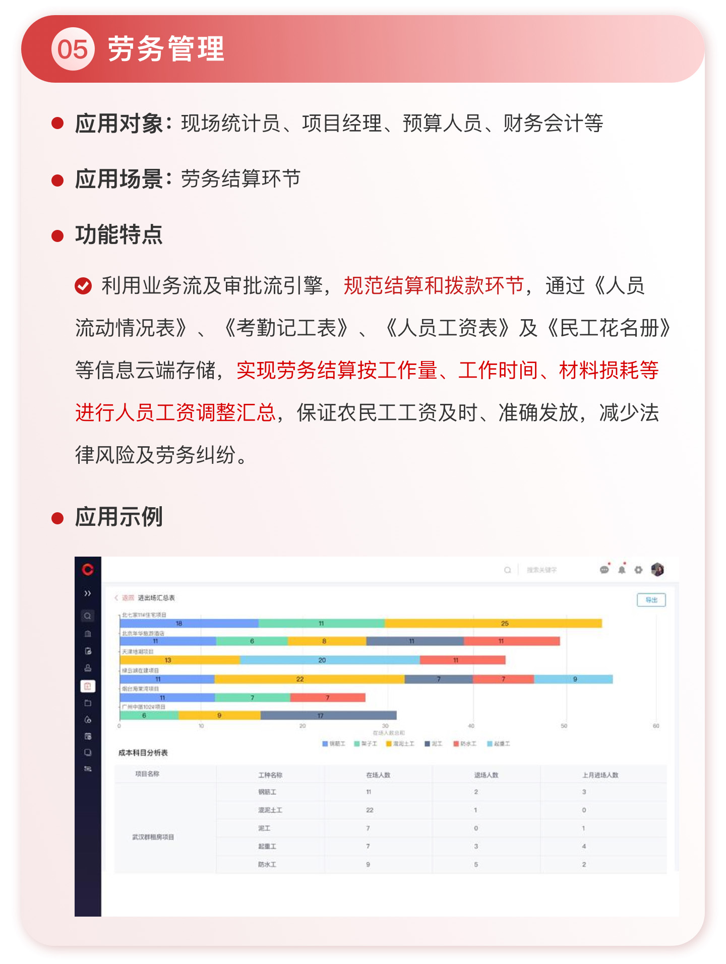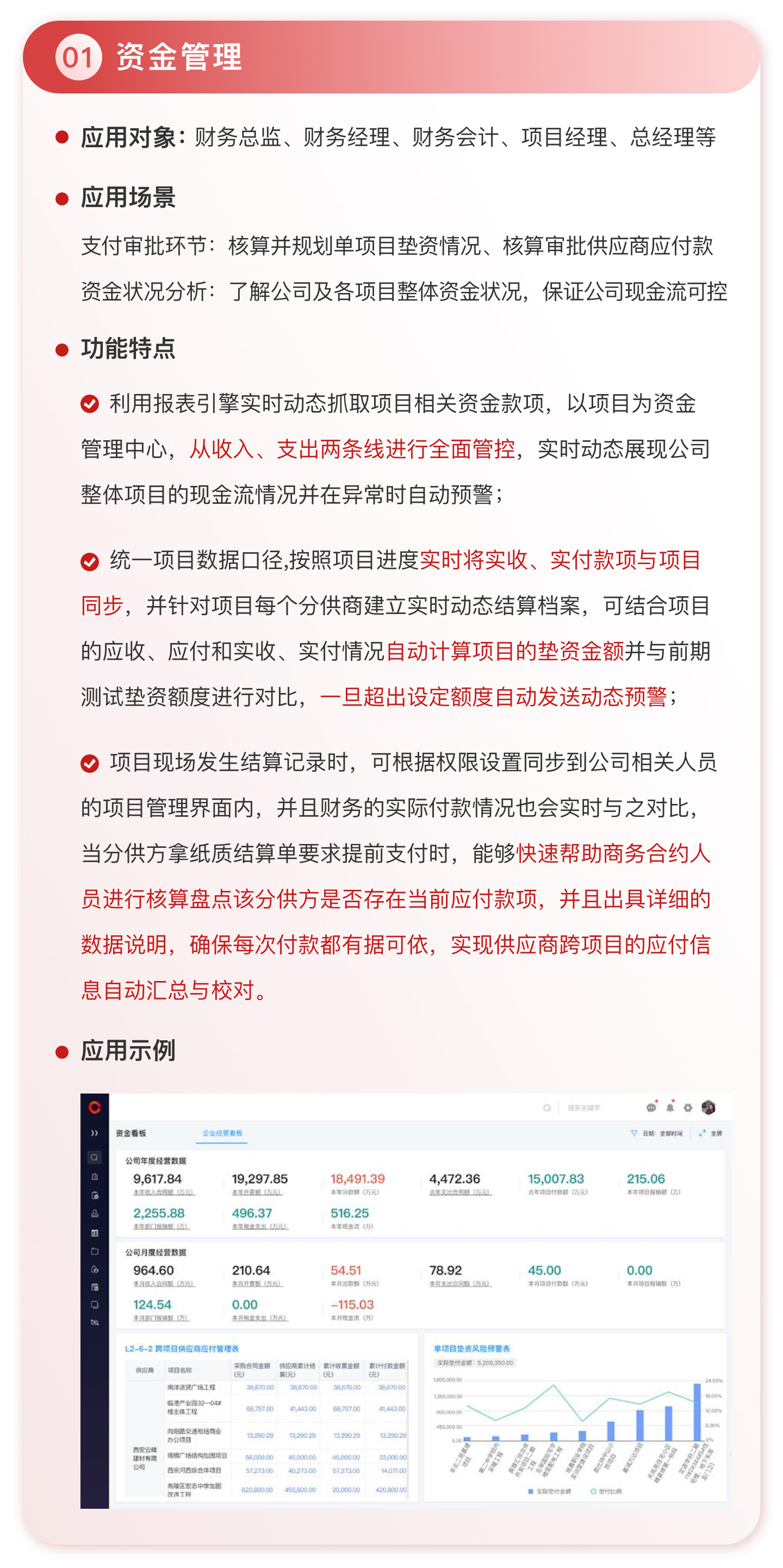 此外,紅圈系統(tǒng)能夠?yàn)榻ㄖこ唐髽I(yè)決策者實(shí)時(shí)呈現(xiàn)動(dòng)態(tài)數(shù)據(jù)、提供智能數(shù)據(jù)分析,讓管理者實(shí)時(shí)了解項(xiàng)目的整體運(yùn)營(yíng)效率及效益是否達(dá)標(biāo)、經(jīng)營(yíng)風(fēng)險(xiǎn)是否可控,滿足建筑工程企業(yè)數(shù)字化管理升級(jí)的需求,提升企業(yè)經(jīng)營(yíng)管理能力,實(shí)現(xiàn)工程項(xiàng)目施工全生命周期的降本增效。該產(chǎn)品主要應(yīng)用于產(chǎn)值為 5,000 萬-20 億的建筑工程行業(yè)企業(yè)。
