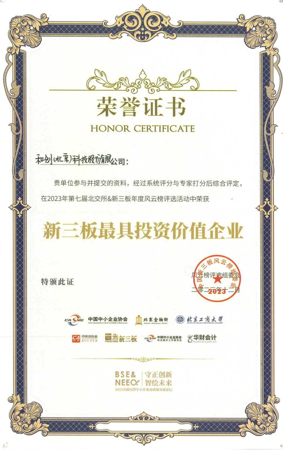 經(jīng)由北交所及新三板投資者保護(hù)指數(shù)綜合評(píng)選,和創(chuàng)科技榮獲第七屆北交所&新三板年度風(fēng)云榜盛典“新三板最具投資價(jià)值企業(yè)”,和創(chuàng)科技創(chuàng)始人/總經(jīng)理劉學(xué)臣被評(píng)為“新三板優(yōu)秀企業(yè)家”。