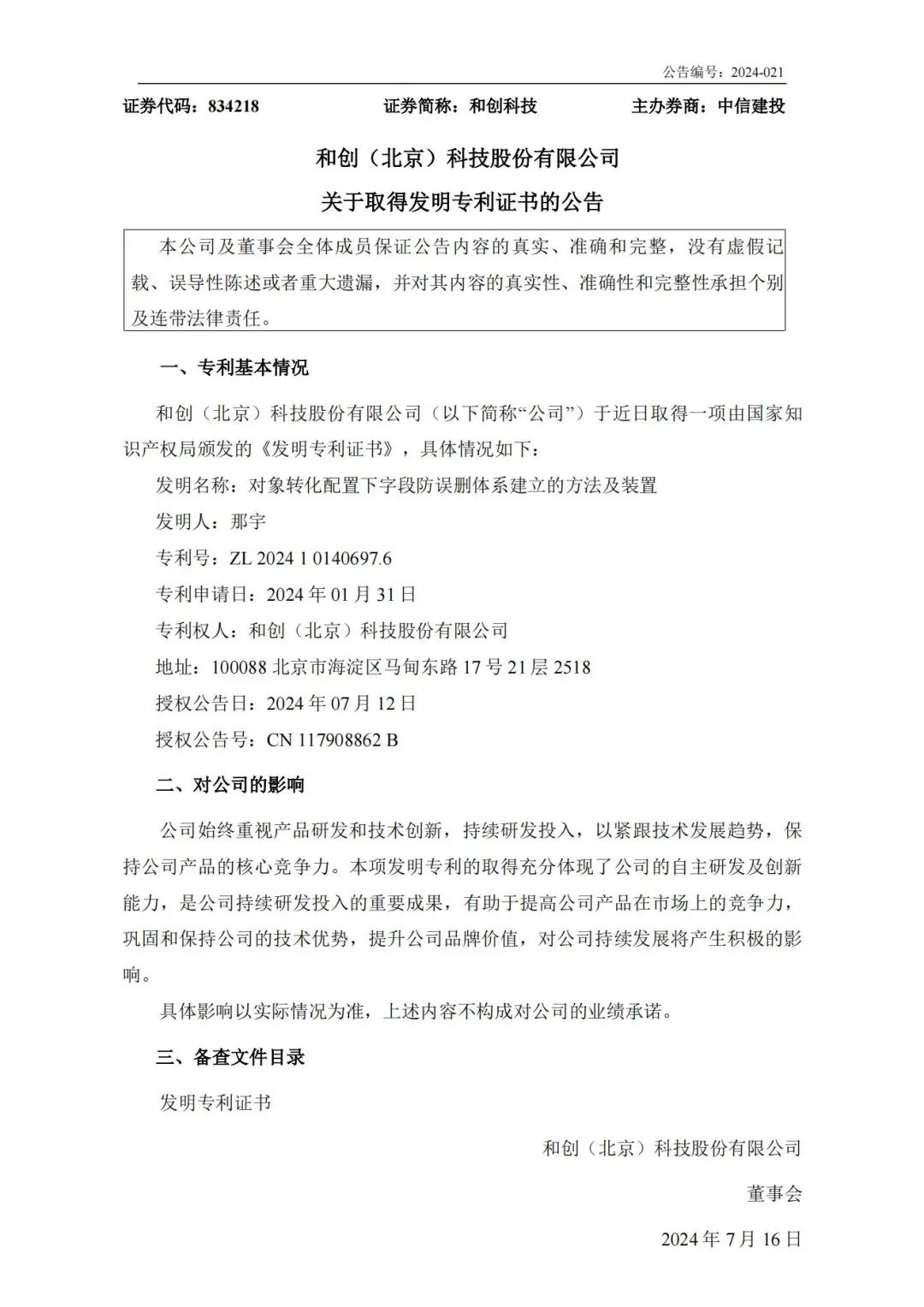 在科技發展日新月異的今天,每一項新的專利都代表著一次技術的革新與突破。近日,和創科技再迎一項技術創新,榮獲最新專利——“對象轉化配置下字段防誤刪體系建立的方法及裝置”