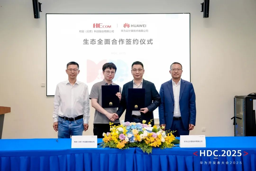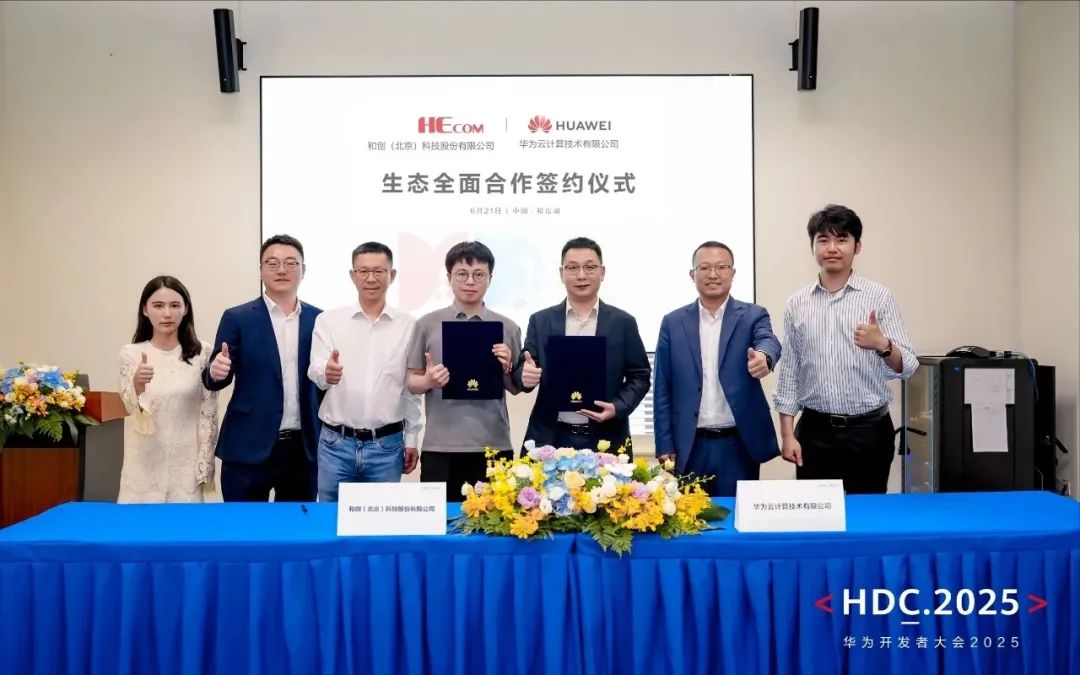 在2025華為開發(fā)者大會期間,和創(chuàng)(北京)科技股份有限公司(以下簡稱“和創(chuàng)科技”)與華為云計算技術(shù)有限公司(以下簡稱“華為云”)簽署生態(tài)全面合作協(xié)議,雙方將在聯(lián)合解決方案構(gòu)建、AI應(yīng)用開發(fā)及行業(yè)大模型共創(chuàng)等領(lǐng)域展開全方位合作,共同推動新一代人工智能產(chǎn)品在工程行業(yè)的應(yīng)用落地。在和創(chuàng)科技CEO劉學(xué)臣、華為云生態(tài)發(fā)展與運營部部長陶志強的共同見證下,和創(chuàng)科技副總裁王禹、華為云北京云生態(tài)發(fā)展與運營部部長代表雙方完成簽約。