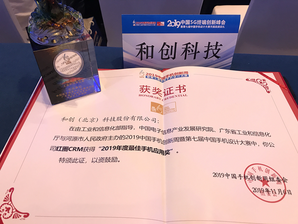 “紅圈CRM”憑借卓越的創新能力、深入垂直行業的專業性、人性化的產品設計能力、成熟的商業能力和穩健的發展態勢,從數百家參選企業中脫穎而出,獲得了由2019年中國5G終端峰會評出的《2019年度最佳手機應用(APP)獎》。