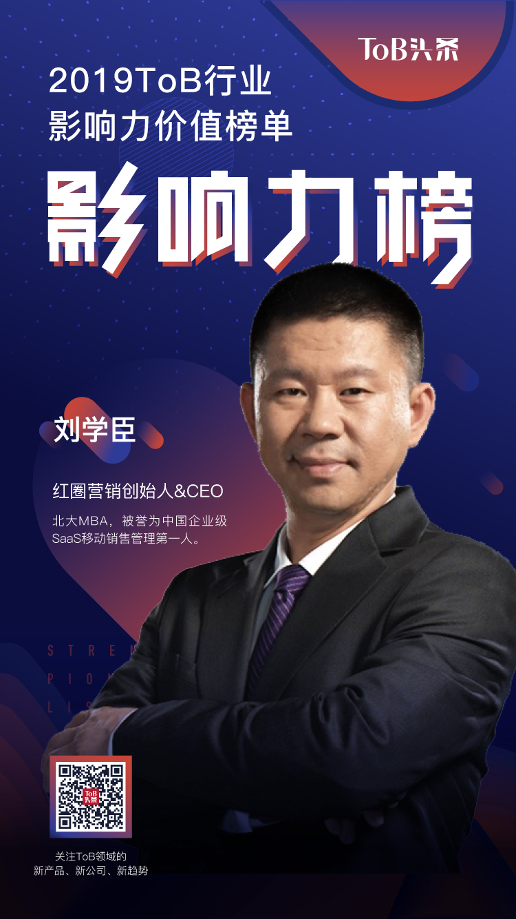近日,由“ToB行業(yè)頭條”主辦的【ToB行業(yè)2019影響力價值榜單——人物榜】重磅發(fā)布,紅圈營銷創(chuàng)始人兼CEO劉學(xué)臣榮登“ToB行業(yè)影響力人物榜”。