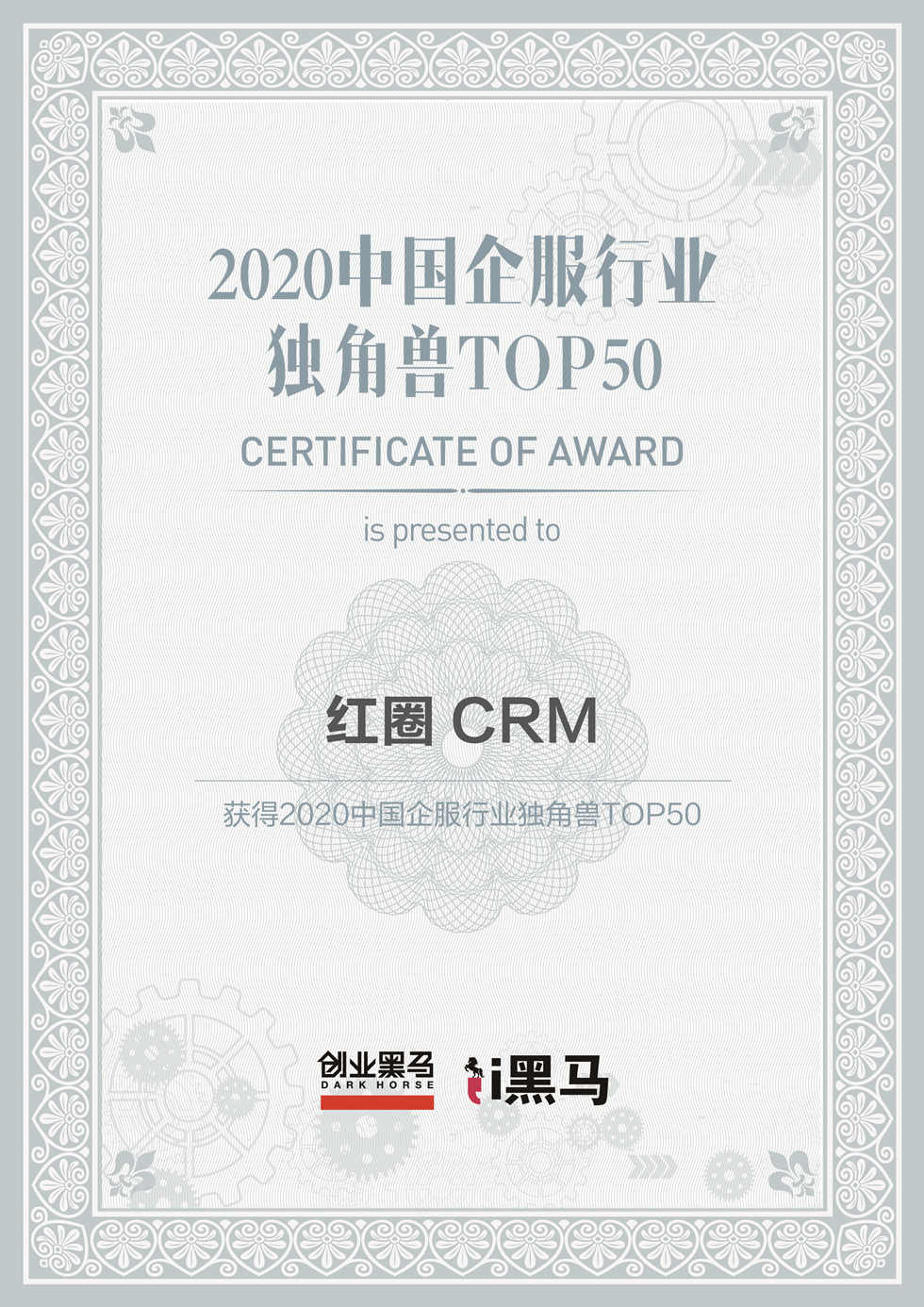 經過多輪線上綜合評審會和最終角逐,紅圈CRM 作為 CRM 領域唯一代表企業入選《2020 中國企服行業獨角獸 TOP50》,該榜單在 12 月 18 日創業黑馬主辦的的第十三屆創業家年會上隆重發布。