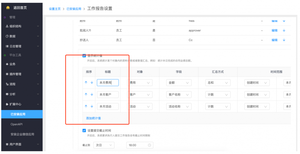 - 后臺設置:系統設置——擴展中心——已安裝應用——工作報告,類型設置支持新建類型;在模板設置中,可以按業務類型設置不同的字段和統計值;統計值設置,支持自定義名稱;
