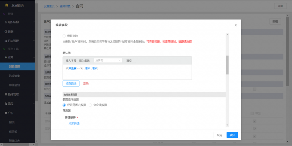 可以選擇下游對象和相關操作,其中資料編輯需勾選具體字段,可選范圍是下游對象字段追蹤里的字段