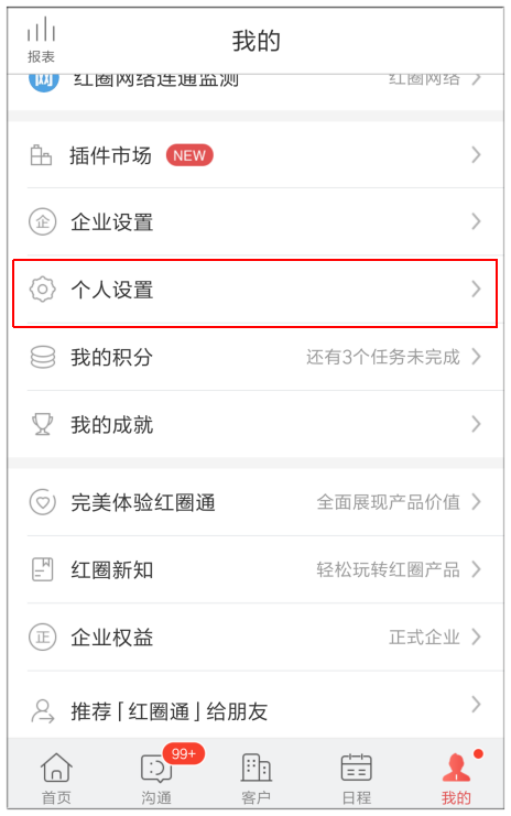 首先,打開紅圈通,進(jìn)入【我的】,然后下拉屏幕點(diǎn)擊【個(gè)人設(shè)置】;