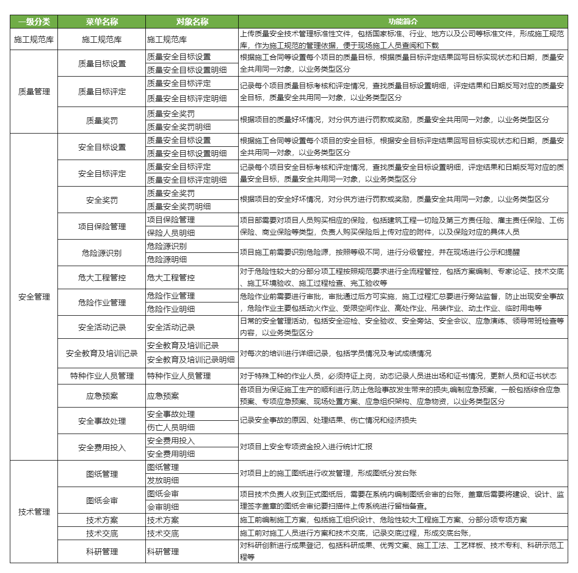 ● 工管理內容主要針對大型總包項目施工現場業務管理,主要包括質量、安全、技術管理,通過競品分析和客戶業務分析,梳理出通用性較強、使用較多的功能點,滿足客戶對現場施工管理需求。