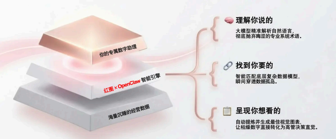 BOSS助理接入OpenClaw,標(biāo)志著紅圈工程在"AI+企業(yè)管理"領(lǐng)域邁出了關(guān)鍵一步。這不是簡(jiǎn)單的接口開(kāi)放,而是軟件能力與AI智能的深度融合: