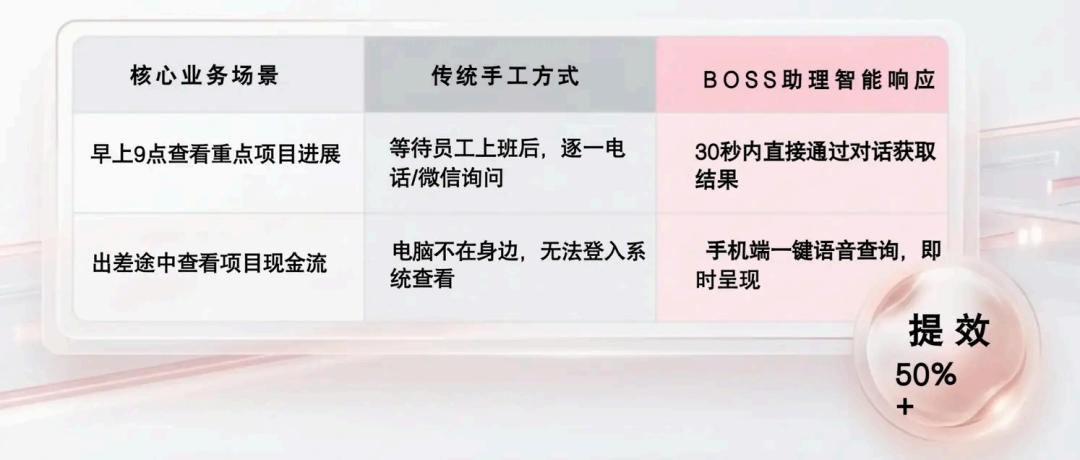 BOSS助理以"智能匯報(bào)、精準(zhǔn)呈現(xiàn)、數(shù)據(jù)安全"三大核心優(yōu)勢(shì)為支撐,通過(guò)AI意圖深度識(shí)別與數(shù)據(jù)分析模型,實(shí)現(xiàn)了數(shù)據(jù)獲取的革命性突破: