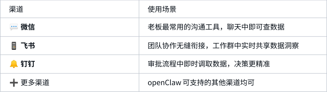 這意味著什么?意味著管理者無(wú)需打開(kāi)復(fù)雜的系統(tǒng)界面,無(wú)需學(xué)習(xí)繁瑣的操作流程,只需通過(guò)微信、飛書(shū)、釘釘?shù)热粘贤üぞ撸窳奶煲粯幼匀坏靥岢鰡?wèn)題,就能即時(shí)獲取關(guān)鍵經(jīng)營(yíng)數(shù)據(jù)。