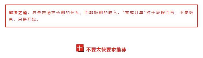 在你完成這個(gè)訂單之后,真正的工作才開(kāi)始,因?yàn)槟汩_(kāi)始建立某種關(guān)系,以致于你可以產(chǎn)生后續(xù)業(yè)務(wù),以及推薦銷售,而這兩者比贏得新業(yè)務(wù)更容易,也更有利潤(rùn)。