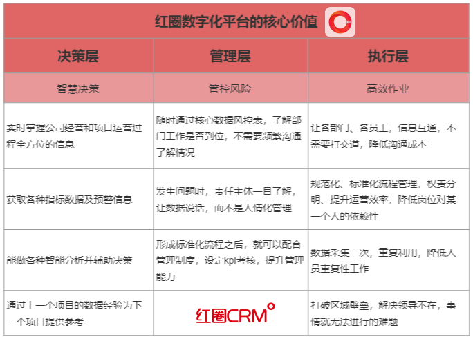 1、紅圈以助力企業(yè)營(yíng)收為目的,首先站在決策者的角度,充分考慮老板的項(xiàng)目經(jīng)營(yíng)管理目標(biāo),制定符合目標(biāo)的整體管理方案,然后圍繞執(zhí)行部門(mén)的工作習(xí)慣做考量,搭建適合一線員工日常工作的操作流程,有效避免上層決策與基層操作的割裂問(wèn)題。