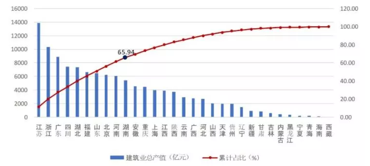 除江蘇、浙江外,總產(chǎn)值超過5000億元的還有廣東、四川、湖北、福建、山東、北京、河南、湖南8個地區(qū),上述10省市完成的建筑業(yè)總產(chǎn)值占全國建筑業(yè)總產(chǎn)值的65.94%(圖1)。