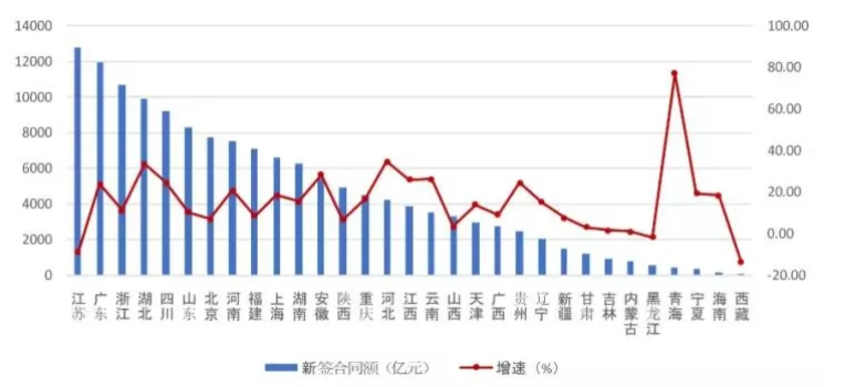 圖3 2021年上半年各地區(qū)建筑業(yè)企業(yè)新簽合同額及增速