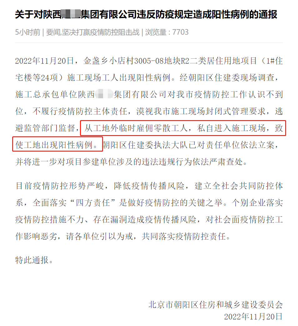 日前,北京市朝陽區(qū)住建委發(fā)布了關(guān)于《關(guān)于對(duì)陜西XX集團(tuán)有限公司違反防疫規(guī)定造成陽性病例的通報(bào)》。