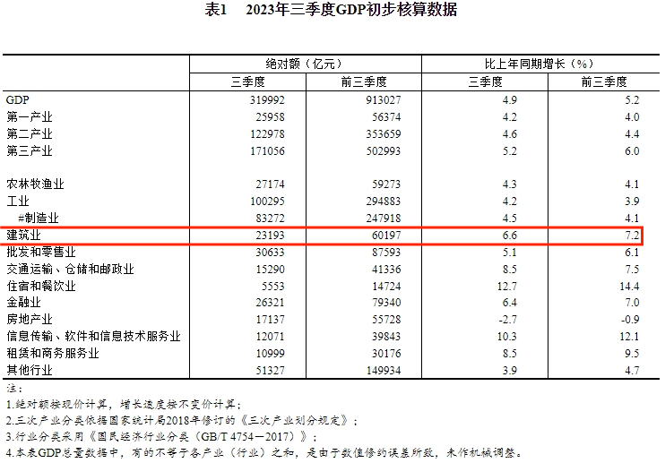 10月18日,國家統(tǒng)計局發(fā)布2023年三季度國民經(jīng)濟(jì)相關(guān)數(shù)據(jù)。初步核算,前三季度國內(nèi)生產(chǎn)總值913027億元,按不變價格計算,同比增長5.2%。建筑業(yè)第三季度總產(chǎn)值23193億元,前三季度60197億元。