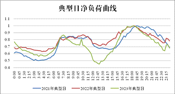 由于湖南光伏發(fā)電裝機(jī)的快速增長(zhǎng),湖南電網(wǎng)凈負(fù)荷曲線(電網(wǎng)凈負(fù)荷=電網(wǎng)負(fù)荷-新能源出力-外受電)產(chǎn)生向“鴨子型曲線”轉(zhuǎn)變的趨勢(shì)(見(jiàn)圖),午間腰荷時(shí)段凈負(fù)荷越來(lái)越低,該時(shí)段可再生能源消納困難情況開(kāi)始顯現(xiàn)。以2023年某日為例,該日光伏發(fā)電出力較大,腰荷時(shí)段電網(wǎng)凈負(fù)荷較前兩年同期明顯下降,同時(shí)低于當(dāng)日低谷時(shí)段凈負(fù)荷,導(dǎo)致腰荷時(shí)段新能源消納更為困難。