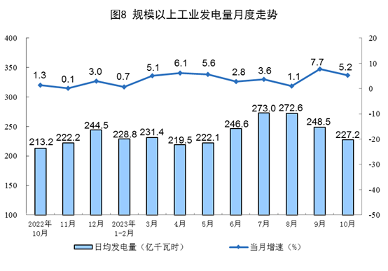 電力生產(chǎn)穩(wěn)步增長。10月份,發(fā)電量7044億千瓦時,同比增長5.2%,增速比9月份放緩2.5個百分點(diǎn),日均發(fā)電227.2億千瓦時。1—10月份,發(fā)電量73330億千瓦時,同比增長4.4%。