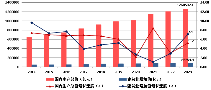 圖1 2014-2023年國內生產總值、建筑業增加值及增速