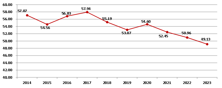 2023年,全國建筑業企業簽訂合同總額724731.07億元,比上年增長2.78%,增速比上年降低4.56個百分點。其中,本年新簽合同額356040.19億元,比上年降低0.91%,增速比上年降低5.19個百分點(圖10)。本年新簽合同額占簽訂合同總額比例為49.13%,比上年下降了1.83個百分點,連續三年下降(圖11)。