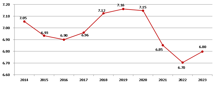 圖2 2014-2023年建筑業增加值占國內生產總值比重