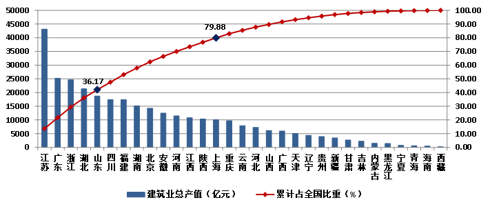 2023年,江蘇建筑業總產值達到43140.15億元,以絕對優勢繼續領跑全國。廣東、浙江、湖北三省的建筑業總產值也都超過了2萬億元,分列第二、三、四位。4省建筑業總產值共占全國建筑業總產值的36.17%。除這4省外,總產值超過1萬億元的還有山東、四川、福建、湖南、北京、安徽、河南、江西、陜西、上海10個省市,上述14個地區完成的建筑業總產值占全國建筑業總產值的79.88%(圖15)。
