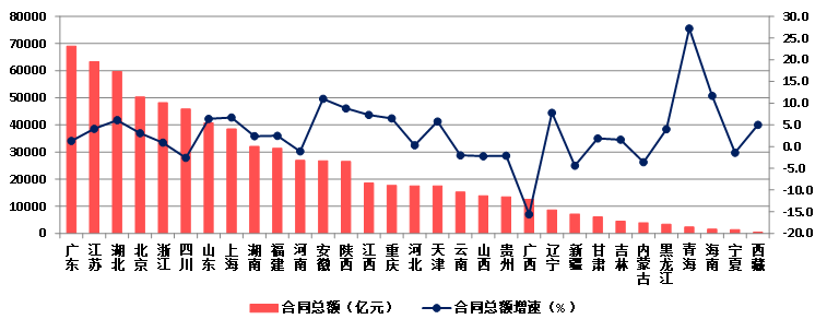 2023年,廣東建筑業企業簽訂合同總額繼續排在首位,達到68991.22億元,比上年增長1.3%;江蘇建筑業企業以63351.14億元排在第二位,比上年增長4.1%。兩省簽訂的合同總額占全國簽訂合同總額的18.26%。簽訂合同總額超過3萬億元的還有湖北、北京、浙江、四川、山東、上海、湖南、福建等8個地區。22個地區簽訂合同總額比上年增長,增速超過10%的有青海、海南、安徽等3個地區,9個地區簽訂合同總額出現負增長,其中廣西出現了超過15%的負增長(圖19)。