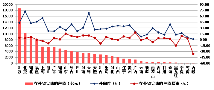 圖18 2023年各地區跨省完成的建筑業總產值及外向度