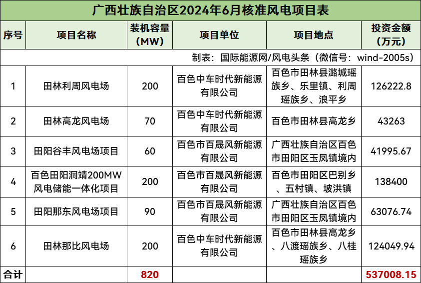 廣西核準(zhǔn)6個(gè)風(fēng)電項(xiàng)目,總規(guī)模820MW,總投資537008.15萬(wàn)元,均為陸上風(fēng)電項(xiàng)目。