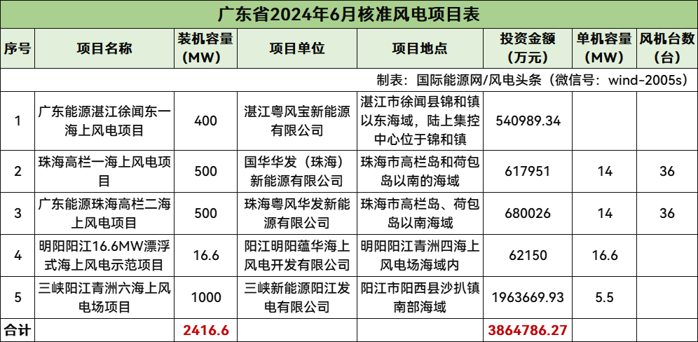 廣東核準(zhǔn)5個(gè)風(fēng)電項(xiàng)目,總規(guī)模2416.6MW,總投資3864786.27萬(wàn)元,均為海上風(fēng)電項(xiàng)目。