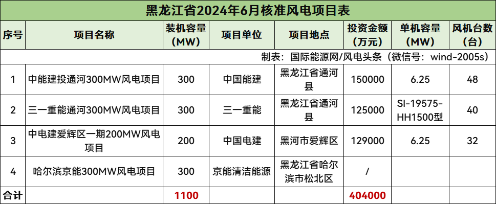 黑龍江核準(zhǔn)4個(gè)風(fēng)電項(xiàng)目,總規(guī)模1100MW,總投資404000萬(wàn)元,均為陸上風(fēng)電項(xiàng)目。