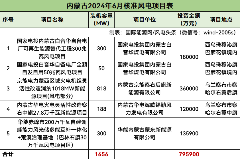 內(nèi)蒙古核準(zhǔn)5個(gè)風(fēng)電項(xiàng)目,總規(guī)模1656MW,總投資795900萬(wàn)元,均為陸上風(fēng)電項(xiàng)目。