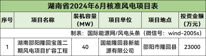 湖南核準(zhǔn)1個(gè)風(fēng)電項(xiàng)目,總規(guī)模40MW,總投資23000萬(wàn)元,為陸上風(fēng)電項(xiàng)目。