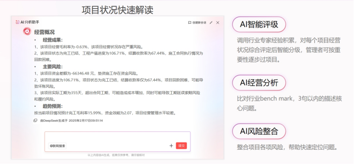 紅圈AI系列智能產(chǎn)品中的項目360°AI解讀,通過整合全維經(jīng)營指標,一鍵生成項目全景作戰(zhàn)圖,讓復雜數(shù)據(jù)轉(zhuǎn)化為清晰決策語言。該功能能夠?qū)椖拷?jīng)營狀況進行智能評級,并整合各項風險,幫助管理者快速定位問題。通過結(jié)構(gòu)化呈現(xiàn)項目關鍵信息、收支分析、資金分析和成本構(gòu)成等數(shù)據(jù),項目360°AI解讀使項目進度監(jiān)控更加精準高效。這種透明化的進度跟蹤,不僅提高了項目執(zhí)行效率,也降低了因延期導致的額外成本。