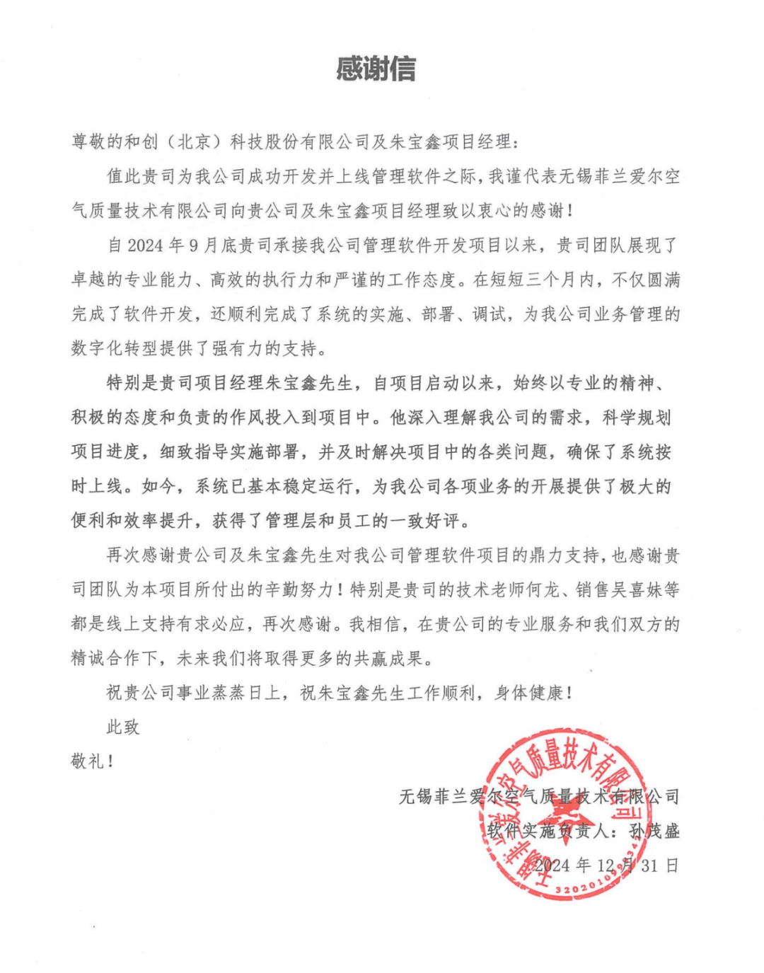 “貴司團(tuán)隊(duì)展現(xiàn)了卓越的專業(yè)能力、高效的執(zhí)行力和嚴(yán)謹(jǐn)?shù)墓ぷ鲬B(tài)度。在短短三個(gè)月內(nèi),不僅圓滿完成了軟件開(kāi)發(fā),還順利完成了系統(tǒng)的實(shí)施、部署、調(diào)試,為我公司業(yè)務(wù)管理的數(shù)字化轉(zhuǎn)型提供了強(qiáng)有力的支持。”